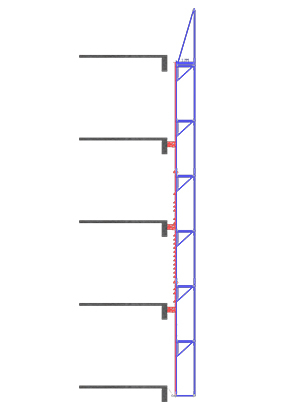 由型钢或铝质型材构成的架体结构及构架、竖向主框架、附墙支座式附着支承装置、防倾装置、防坠装置组成的防护架。